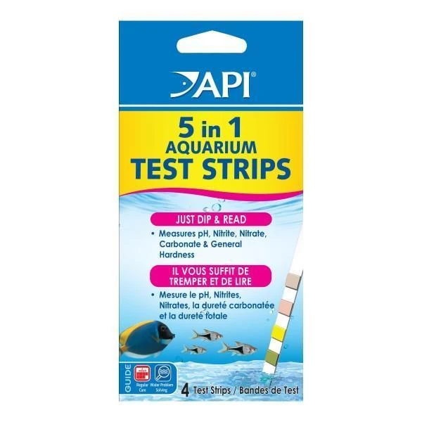 API® 5-IN-1 TEST STRIPS are the quick and easy way to test the 5 most important aquarium water parameters – pH, KH, GH, nitrate, and nitrite – in one easy step. Simply dip one test strip directly into the aquarium, and compare the colours on the strip to the colour card provided to help prevent invisible water problems that can be harmful to fish. Each kit includes detailed information on how to interpret the test results and correct unsafe water conditions.