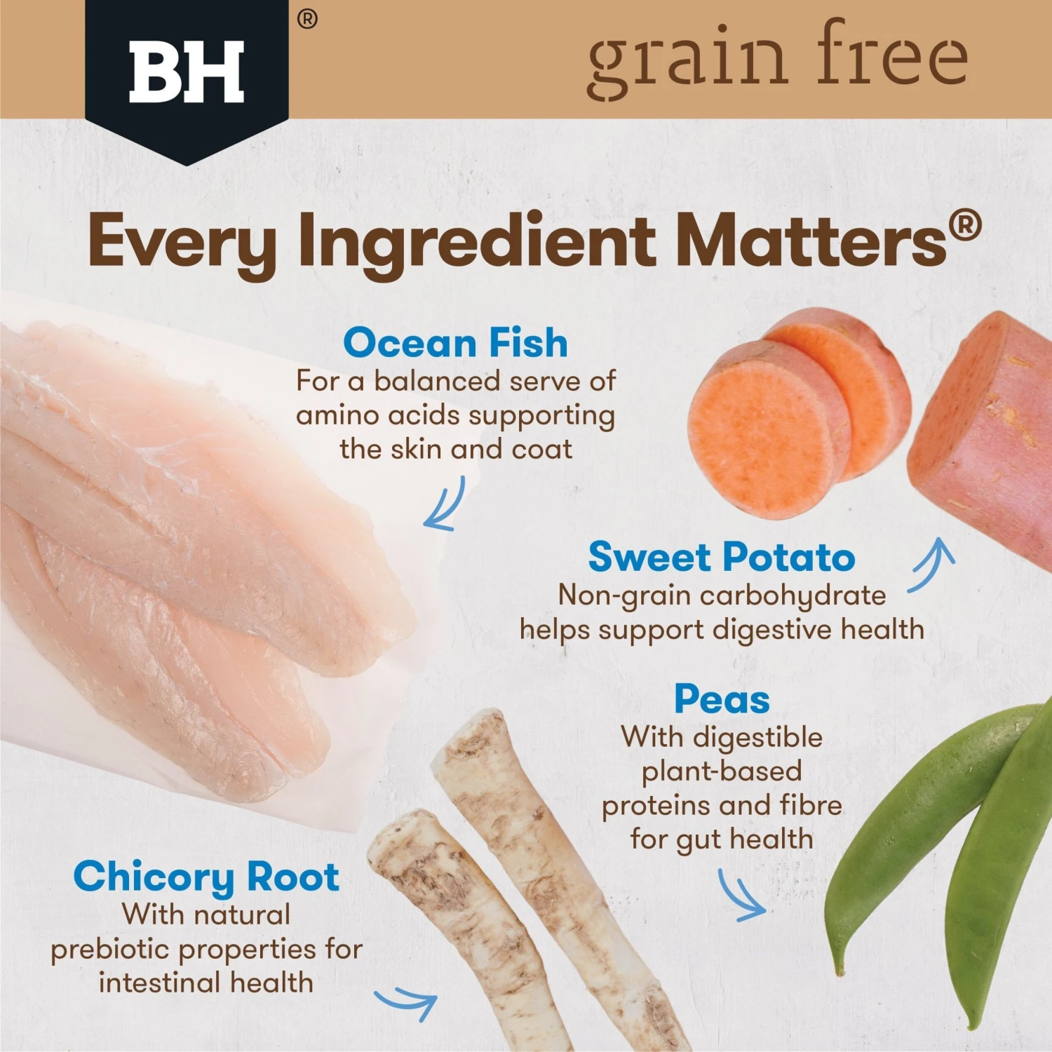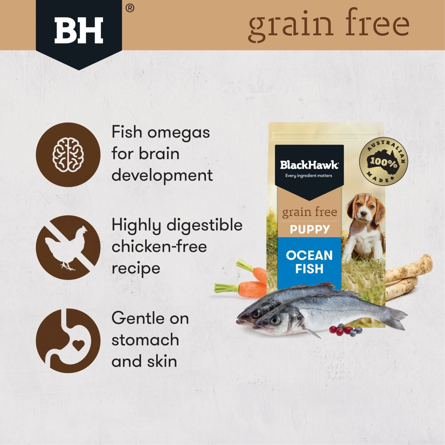 Black Hawk’s new Ocean Fish recipe is made just for puppies, and it half wild-caught fish, fish oil and meat proteins; plus half veggies and fruits. There are so many top-quality ingredients in Ocean Fish – but what you won’t find? Added hormones, genetically modified ingredients – and grains, for a healthy digestive system.