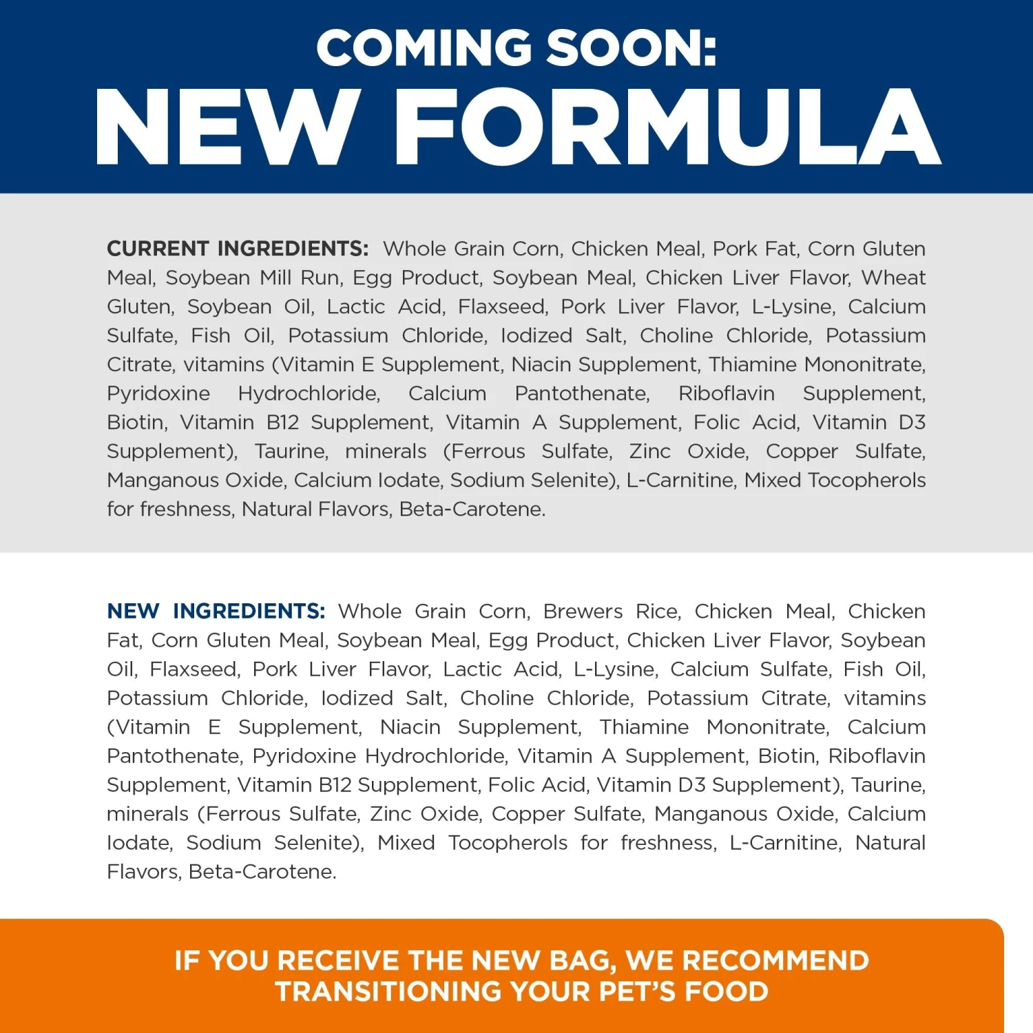 - Wholegrain corn, brewer’s rice, chicken meal, chicken fat, corn gluten meal, soybean meal, egg product, chicken liver flavour, soybean oil, flaxseed, pork liver flavour, lactic acid, L-lysine, calcium sulphate, fish oil, potassium chloride, iodised salt, choline chloride, potassium citrate, vitamins (vitamin E supplement, niacin supplement, thiamine mononitrate, calcium pantothenate, pyridoxine hydrochloride, vitamin a supplement, biotin, riboflavin supplement, vitamin B12 supplement, folic acid, vitamin D3 supplement), taurine, minerals (ferrous sulphate, zinc oxide, copper sulphate, manganous oxide, calcium iodate, sodium selenite), mixed tocopherols for freshness, L-carnitine, natural flavours and beta-carotene