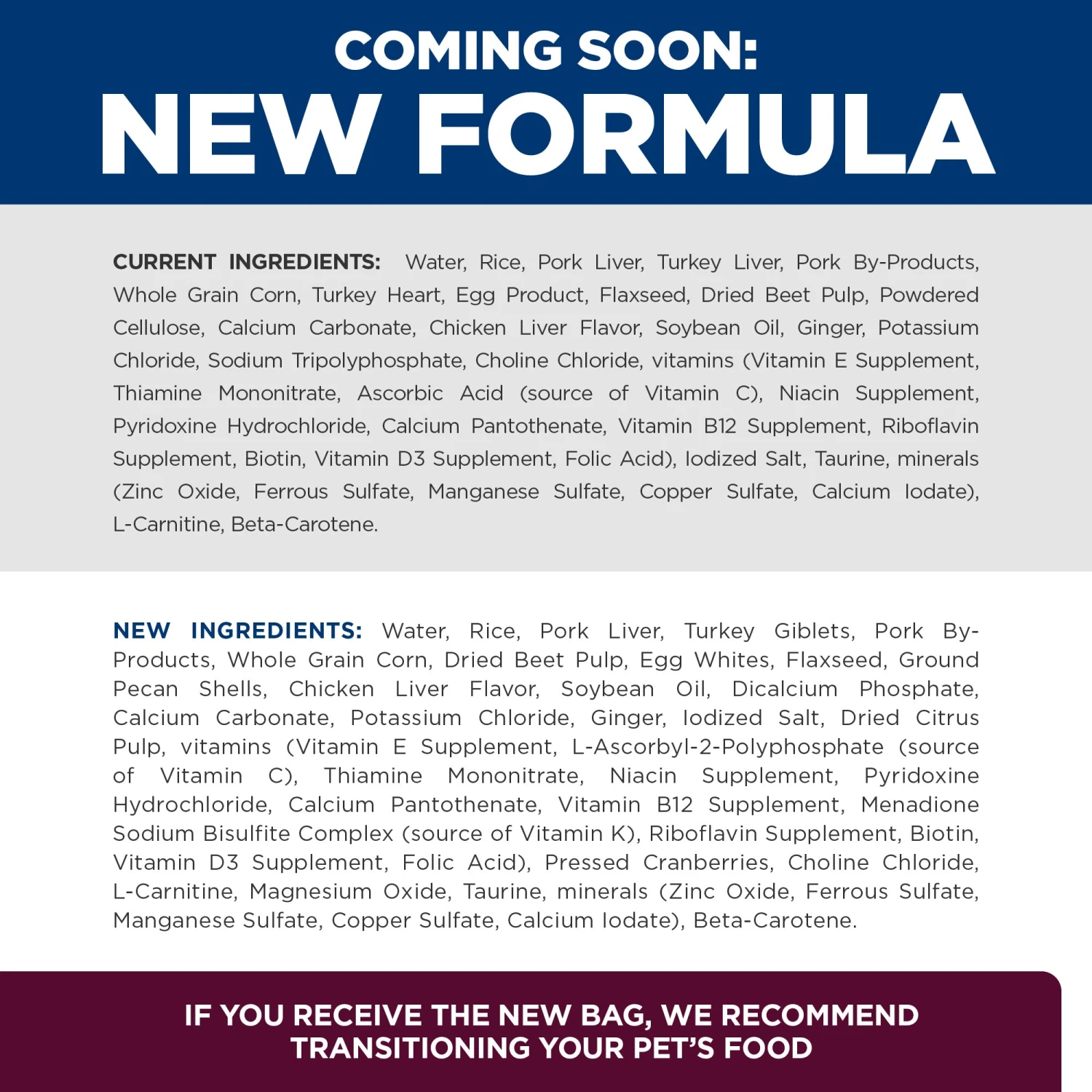 - Water, rice, pork liver, turkey giblets, pork by-products, whole grain corn, dried beet pulp, egg whites, flaxseed, ground pecan shells, chicken liver flavor, soybean oil, dicalcium phosphate, calcium carbonate, potassium chloride, ginger, iodised salt, dried citrus pulp, vitamins (vitamin E supplement, L-ascorbyl-2-polyphosphate (source of vitamin C), thiamine mononitrate, niacin supplement, pyridoxine hydrochloride, calcium pantothenate, vitamin B12 supplement, menadione sodium bisulfite complex (source of vitamin K), riboflavin supplement, biotin, vitamin D3 supplement, folic acid), pressed cranberries, choline chloride, L-carnitine, magnesium oxide, taurine, minerals (zinc oxide, ferrous sulfate, manganese sulfate, copper sulfate calcium iodate) and beta-carotine
