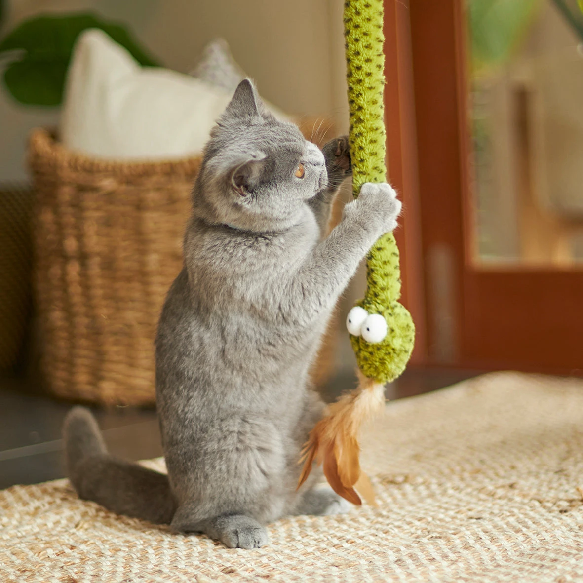 - Long, flexible plastic rod with a long, fluffy fabric snake for your cat to play with