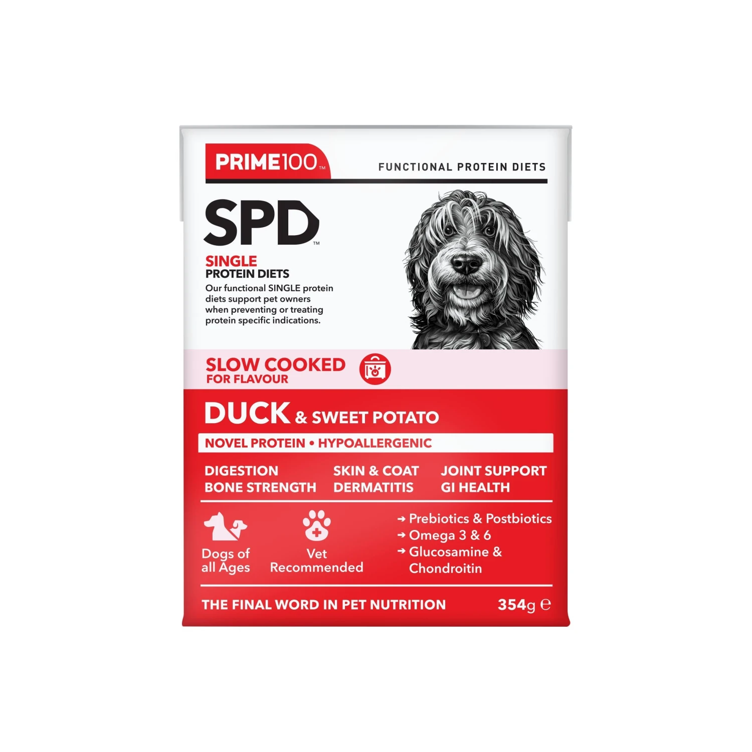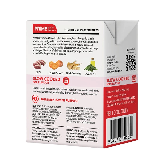 Prime100 SPD™ Slow Cooked Duck & Sweet Potato is a novel, hypoallergenic, single protein diet designed to provide a novel source of protein and a rich source of fibre. Complete and balanced with a natural source of essential amino acids, fatty acids, glucosamine, chondroitin, for dogs of all ages. Plus a carefully balanced calcium phosphorous ratio essential for large and giant breeds.