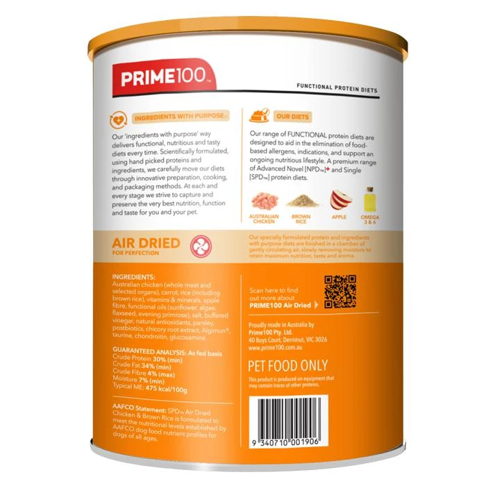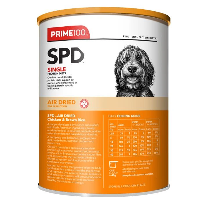 - Australian chicken (whole meat and selected organs), carrot, rice (including brown rice), vitamins & minerals, apple fibre, functional oils (sunflower, algae, flaxseed, evening primrose), salt, buffered vinegar, natural antioxidants, parsley, postbiotics, chicory root extract, Algimun®, taurine, chondroitin, glucosamine. GUARANTEED ANALYSIS: As fed basis Crude Protein 30% (min) Crude Fat 34% (min) Crude Fibre 4% (max) Moisture 7% (min) Typical ME: 475 kcal/100g AAFCO Statement: SPD™ Air Dried Chicken & Brown Rice is formulated to meet the nutritional levels established by AAFCO dog food nutrient profiles for dogs of all ages.