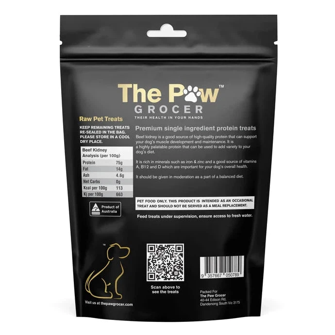 The Paw Grocer Black Label Freeze Dried Beef Kidney, sourced from Victoria, are rich in protein and folate. Nutrient-dense and delicious, these freeze-dried treats retain the raw goodness of the protein without cooking, containing no preservatives, fillers, or additives.