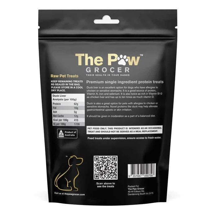 Our responsibly farmed The Paw Grocer Black Label Freeze Dried Duck Livers, sourced from Victoria, provide a biologically appropriate source of essential nutrients for both cats and dogs. As a secreting organ, liver is highly nutrient-dense and plays a crucial role in your pet’s diet. With duck being an excellent hypoallergenic option for pets with allergies or sensitive stomachs, our freeze-dried treats retain raw nutritional value without any additives, fillers, or preservatives.