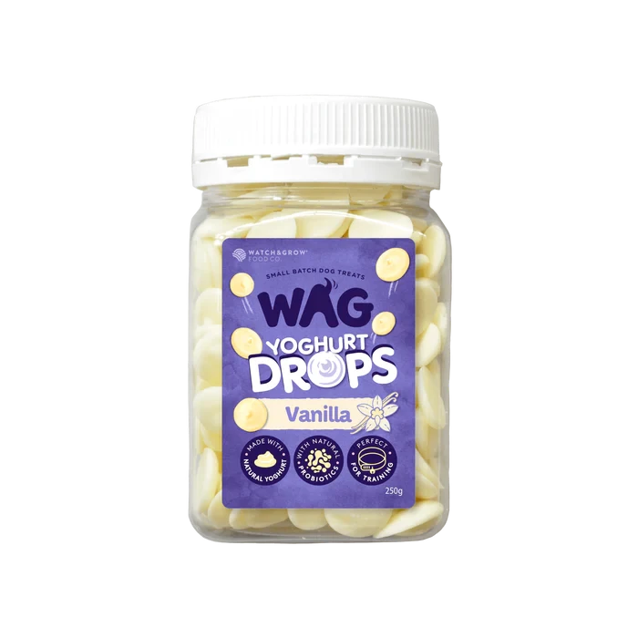 A sweet treat for dogs! WAG Vanilla Yoghurt Drops are a delicious, meat-free, human-grade treat. Perfect for training, WAG Vanilla Yoghurt Drops are bite-sized and full of gut-loving probiotics. Made from natural ingredients, these healthy cheat treats suit doggos of all ages and sizes.