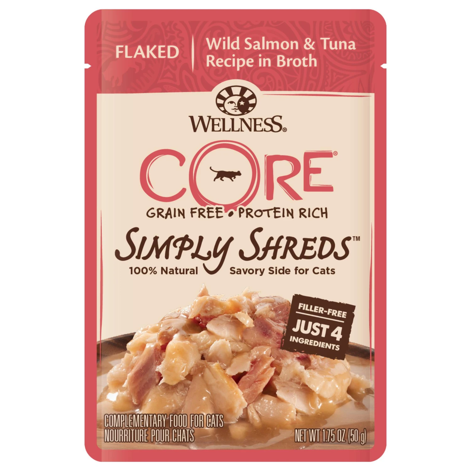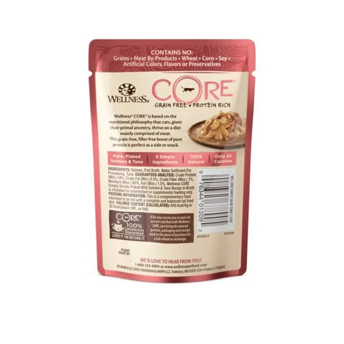 - Made with 100% natural ingredients, including wild, flaked salmon and tuna, served in broth