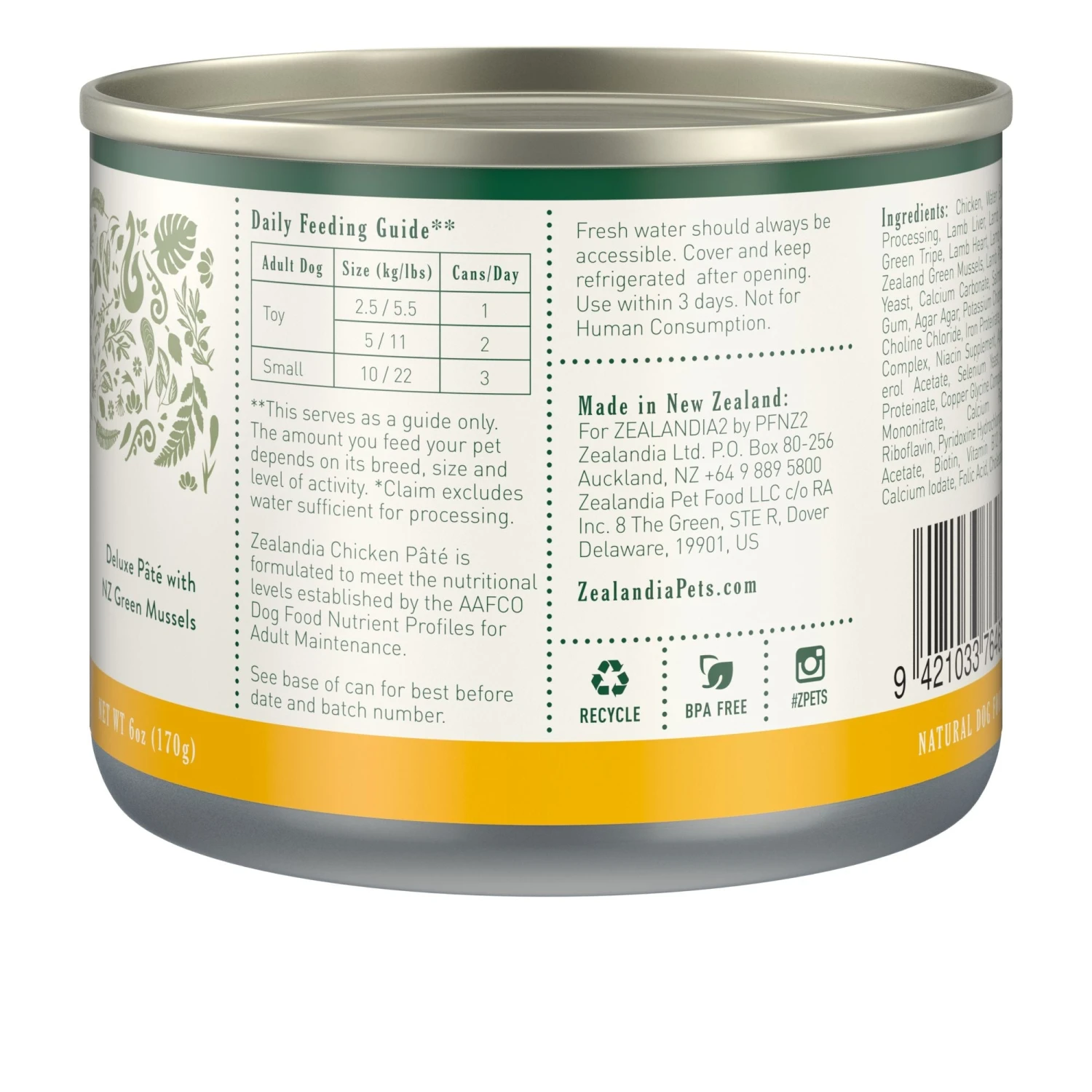 - Deboned chicken, water sufficient for processing, lamb liver, lamb lung, lamb green tripe, lamb heart, lamb kidney, New Zealand green mussel, dried yeast, carrot, cassia gum, agar-agar, salmon oil, calcium carbonate, guar gum, potassium chloride, choline chloride, taurine, iron proteinate, zinc glycine complex, niacin supplement, alpha-tocopherol acetate, selenium yeast, manganese proteinate, copper glycine complex, thiamine mononitrate, calcium pantothenate, riboflavin, pyridoxine hydrochloride, vitamin A acetate, biotin, vitamin B12 supplement, calcium iodate, folic acid and cholecalciferol