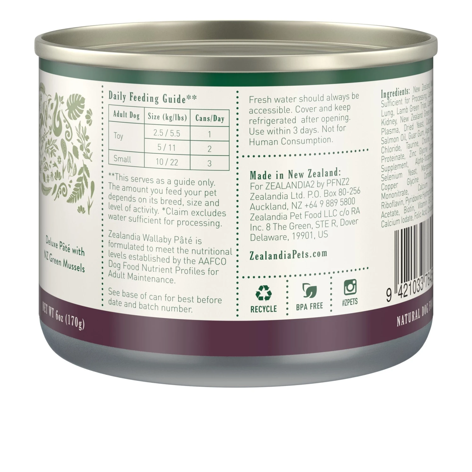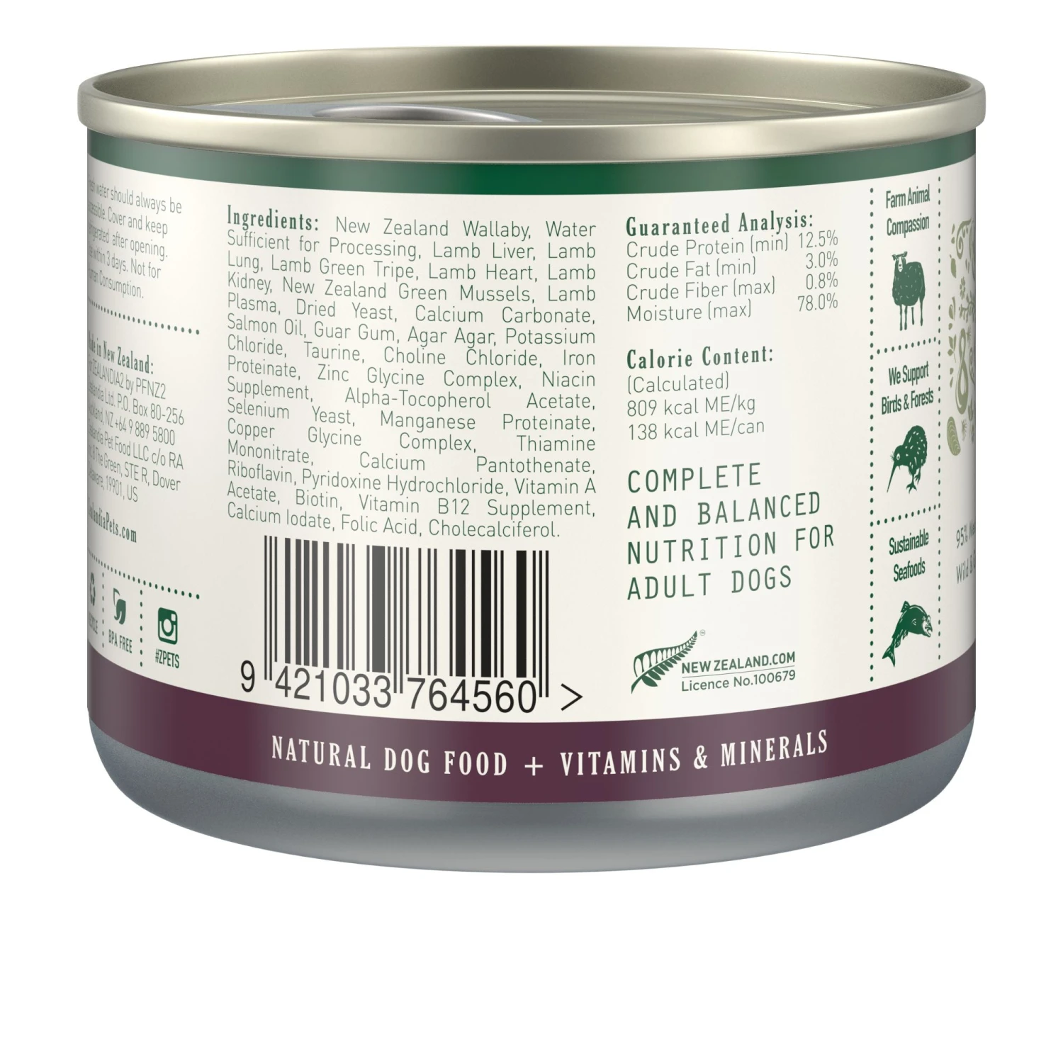 - New Zealand Wallaby, Water Sufficient for Processing, Lamb Liver, Lamb Lung, Lamb Green Tripe, Lamb Heart, Lamb Kidney, New Zealand Green Mussels, Lamb Plasma, Dried Yeast, Agar-Agar, Calcium Carbonate, Salmon Oil, Guar Gum, Potassium Chloride, Taurine, Choline Chloride, Iron Proteinate, Zinc Glycine Complex, Niacin Supplement, Alpha-Tocopherol Acetate, Selenium Yeast, Manganese Proteinate, Copper Glycine Complex, Thiamine Mononitrate, Calcium Pantothenate, Riboflavin, Pyridoxine Hydrochloride, Vitamin A Acetate, Biotin, Vitamin B12 Supplement, Calcium Iodate, Folic Acid, Cholecalciferol.